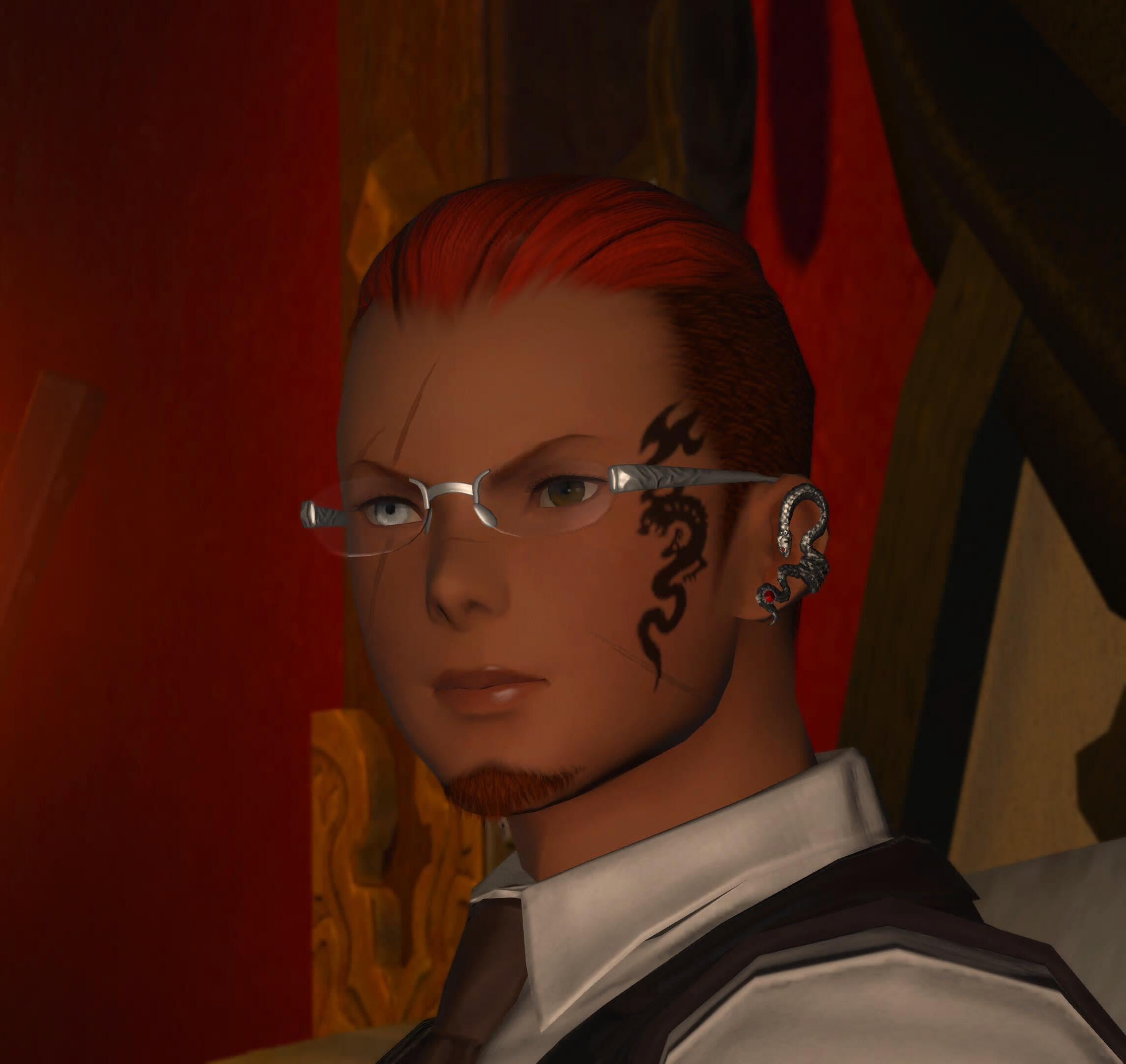 - Dragon tattoo on his face.Both arms covered.