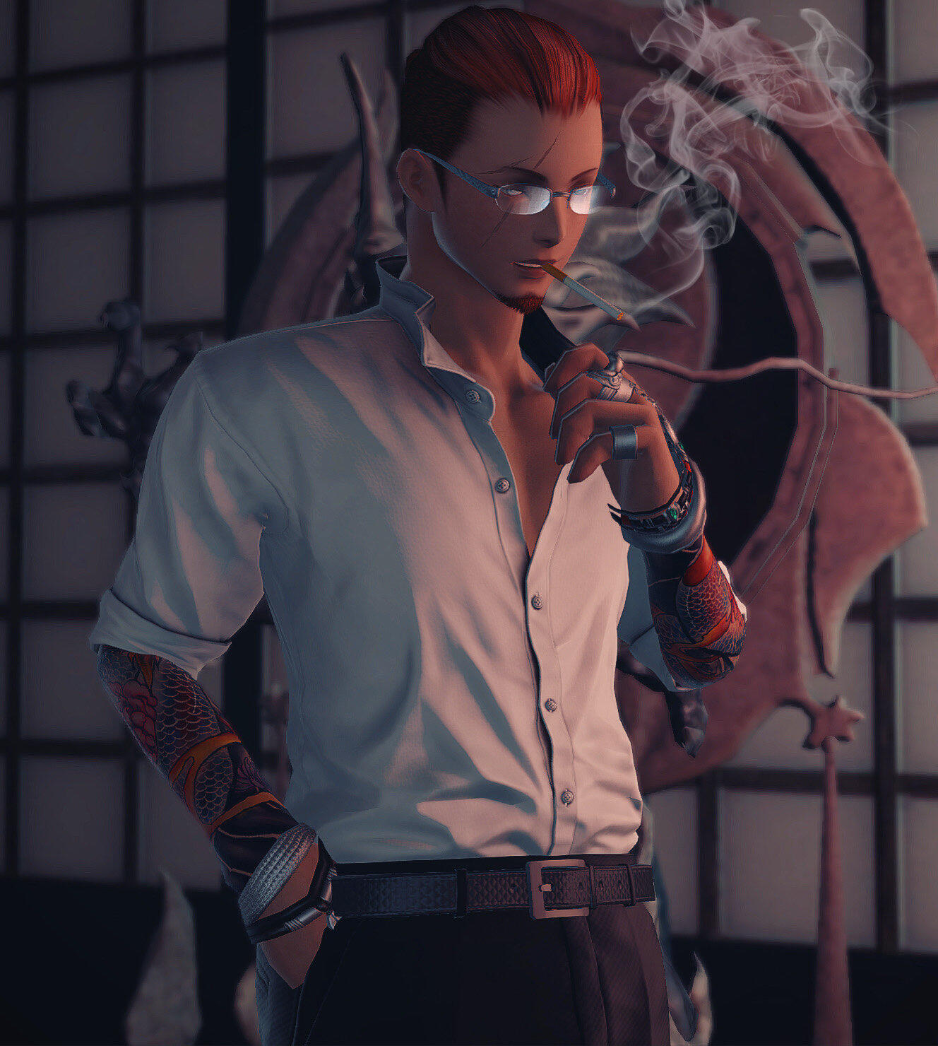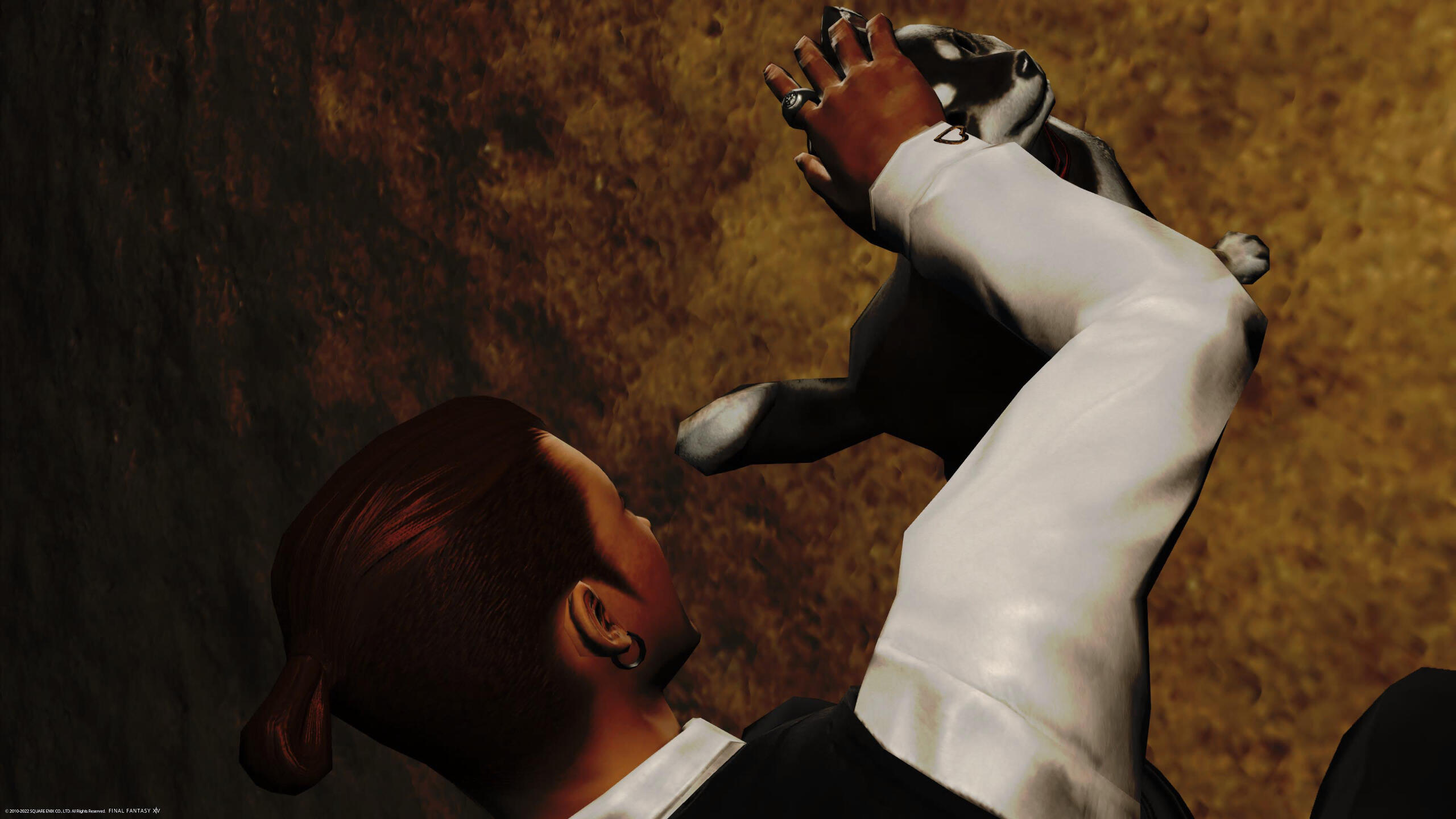 After completing his tasks, Hito wandered through the Rakuza District, passing the time with a cigarette as twilight descended upon Kugane, casting a captivating aura over the city.[Black Hayate]: ”Grrr! -Growl-.“[Hito]: ”Hmm, quite the spirited one you are… Who’s your companion, or perhaps, where do you call home?”Aware that someone had likely abandoned the pup, Hito approached cautiously, extending his hand with an open palm, hoping to gain the trust of the wary canine.
